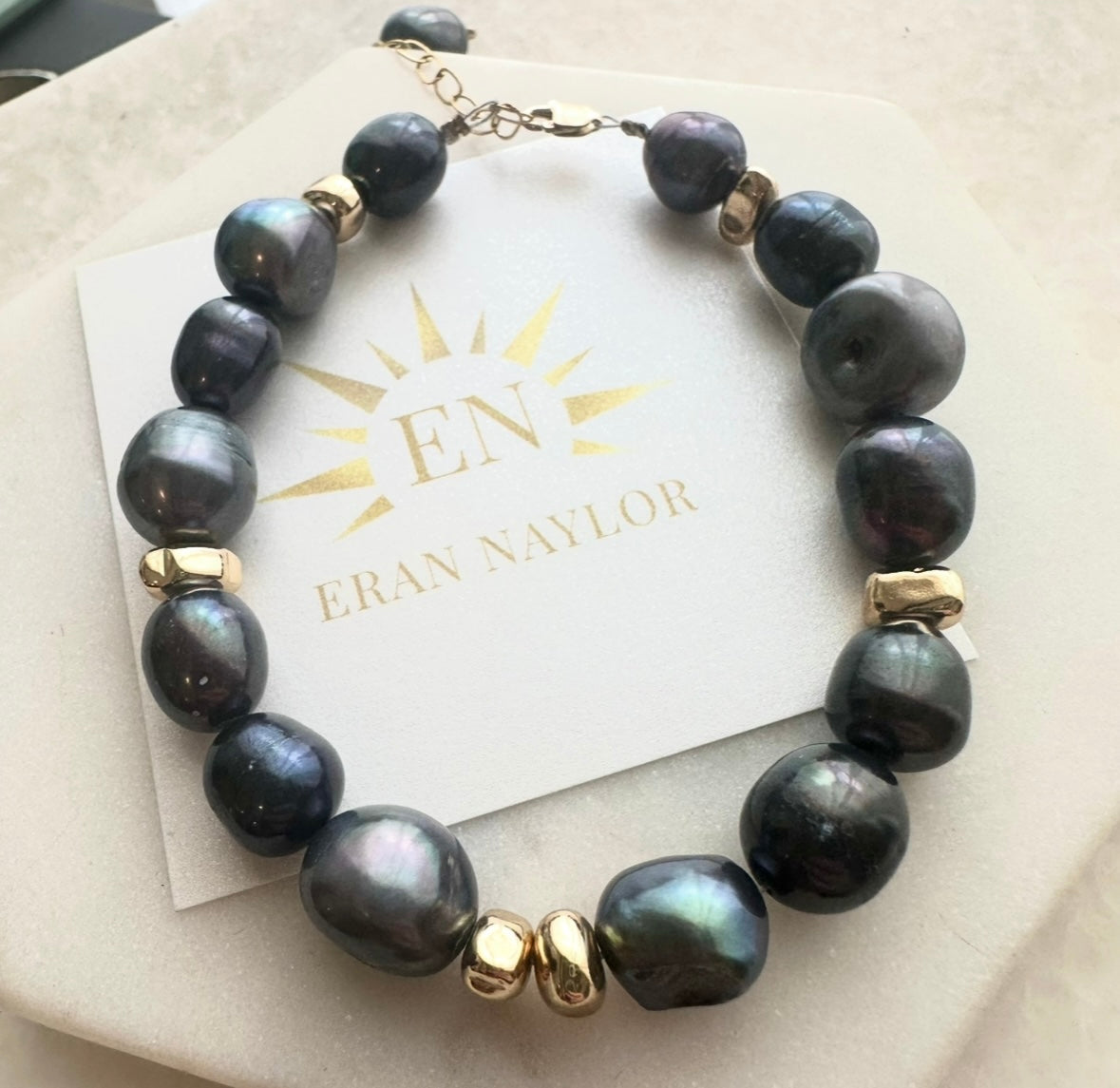 Made with luminous large black freshwater pearls in various shades and gold plated beads this bracelet measures 20cm in Length and has a further 4.5cm in extender chain
