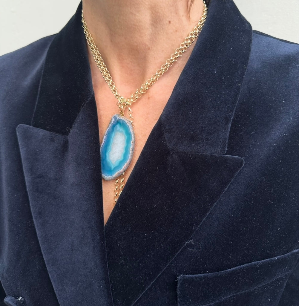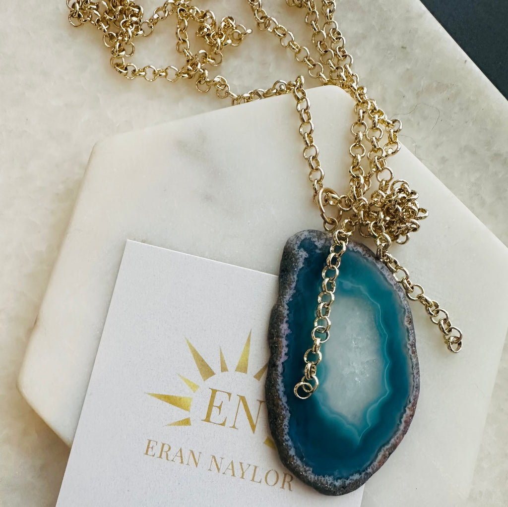 One of a kind. A stunning Geode slice hangs on a gold fill thick chain.
