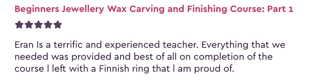 This course can hold up to eight (8) students which will mean that you get enough personal attention from the teacher. You need to be over sixteen (16) to attend this class, have good eyesight, or bring glasses with you and have fairly steady hands. You need to have hair tied back, wear sensible clothing and bring an apron as you may get covered in a fair amount of wax shavings. You do not need to have any previous jewellery making experience - this course is suitable for complete beginners.