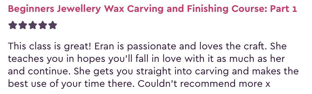 . This voucher is redeemable for a Beginners Wax carving public class part 1 course for 1 person for any date listed on my website running in 2026. The classes run on Wednesday. evenings for two weeks at Gasworks arts park in Albert park- 6.30pm-9pm. Both weeks must be attended to finish a ring.